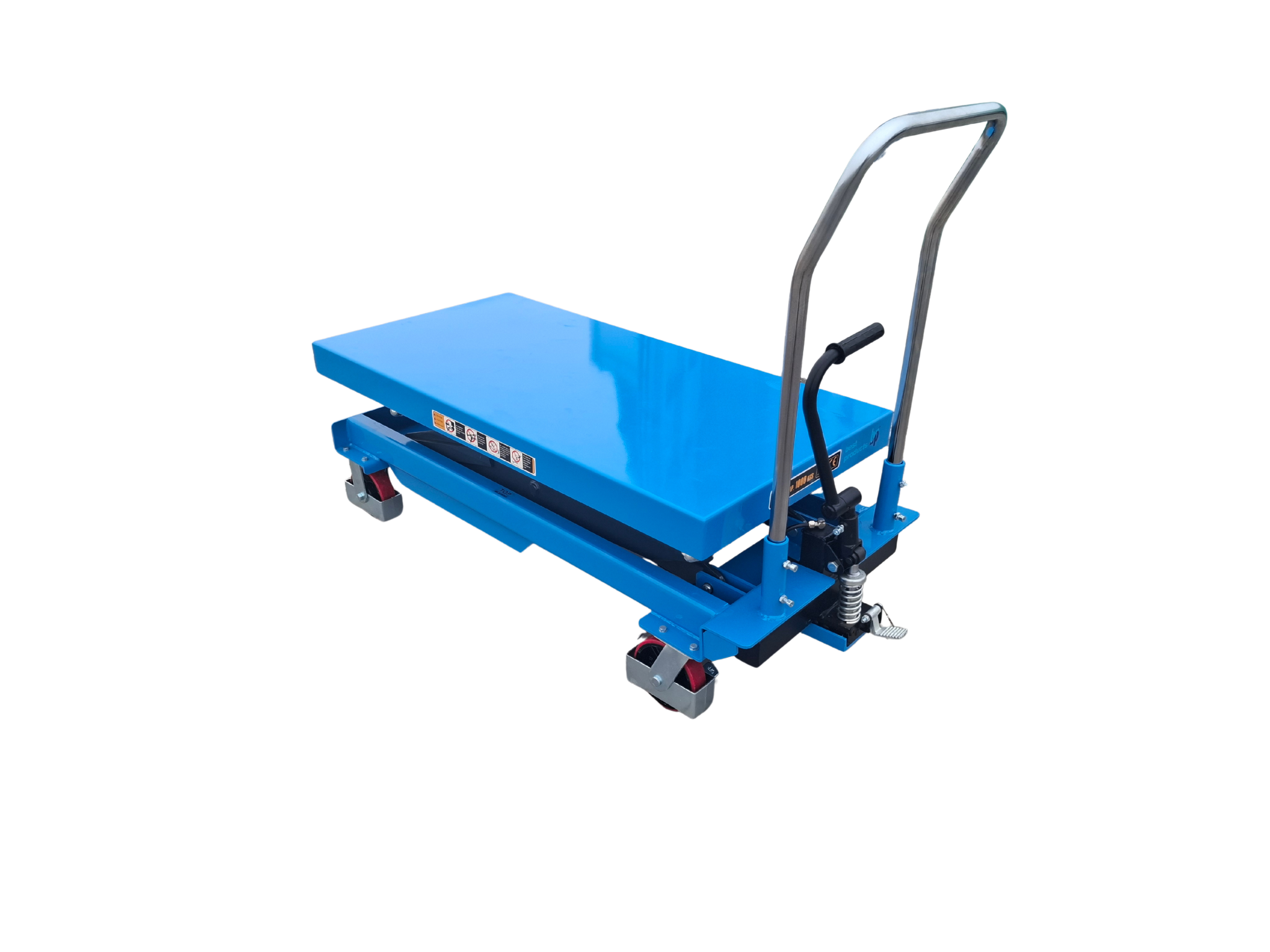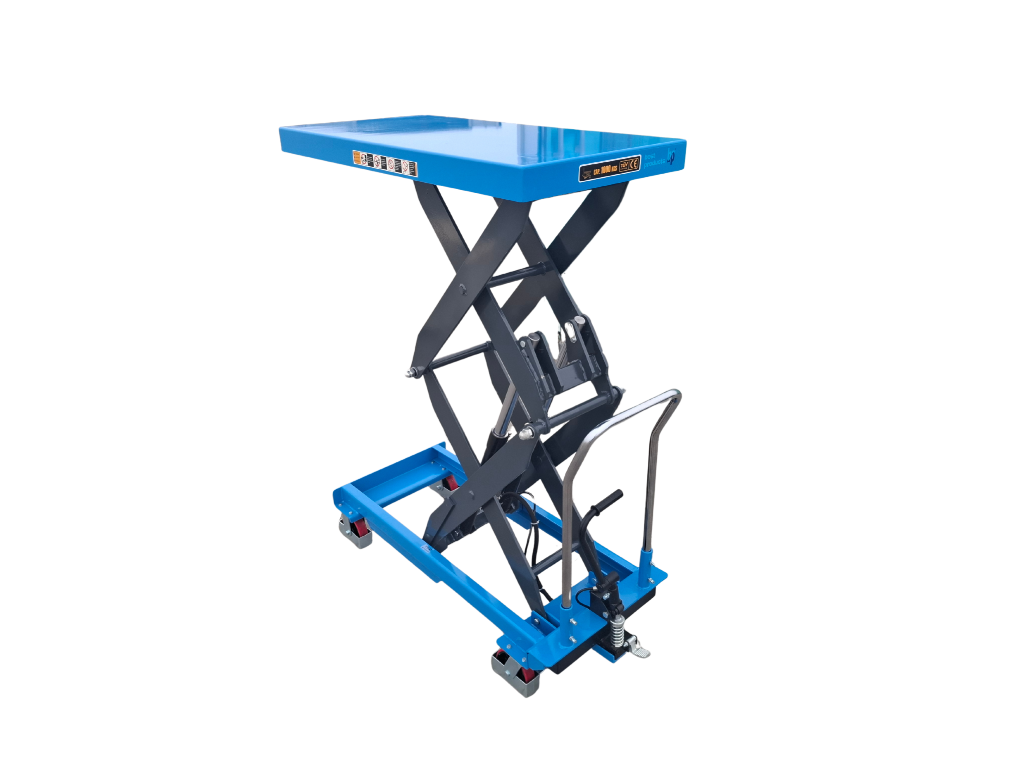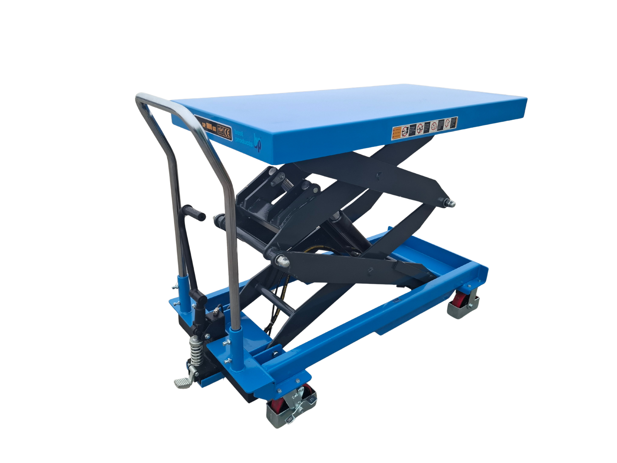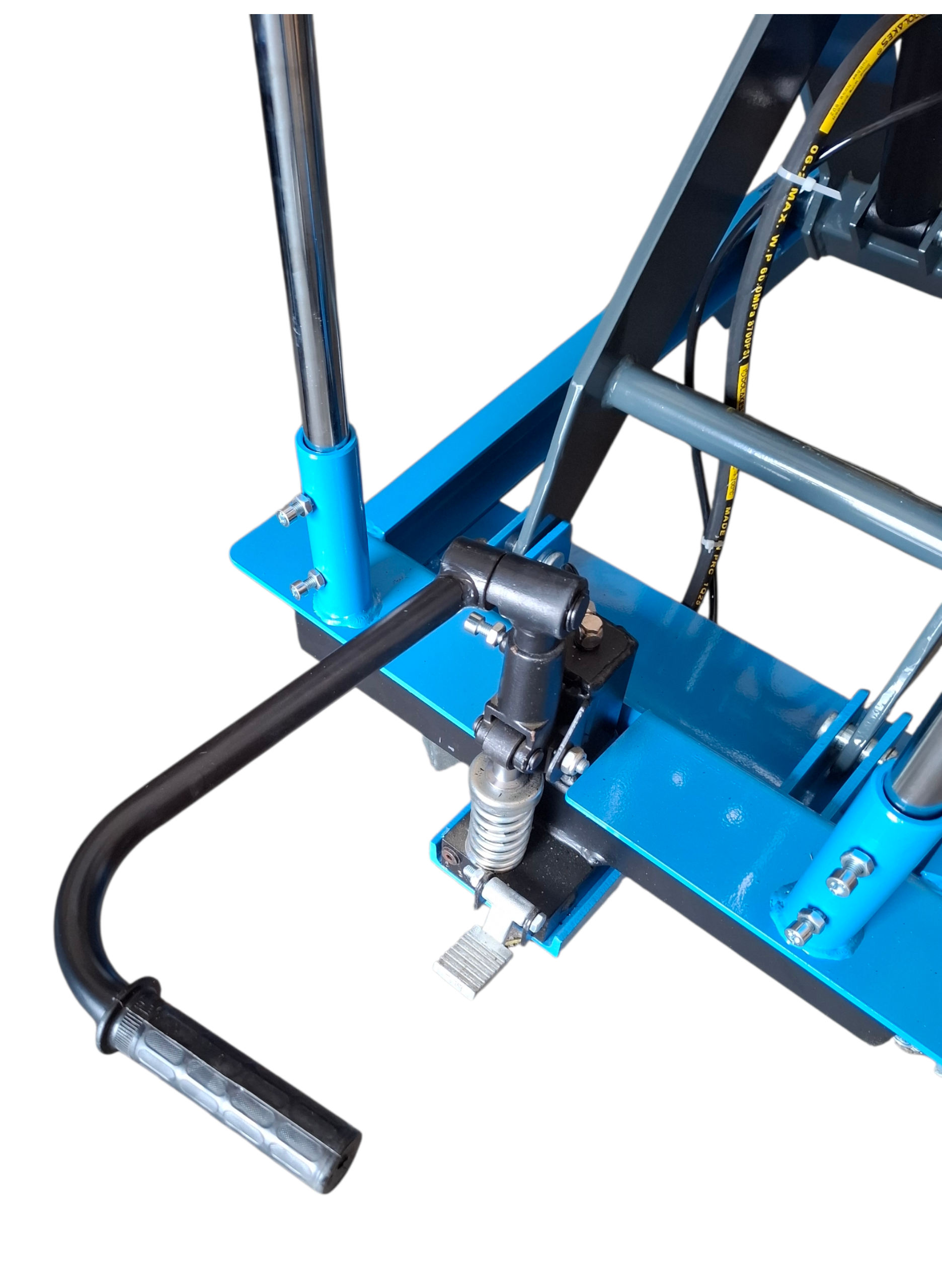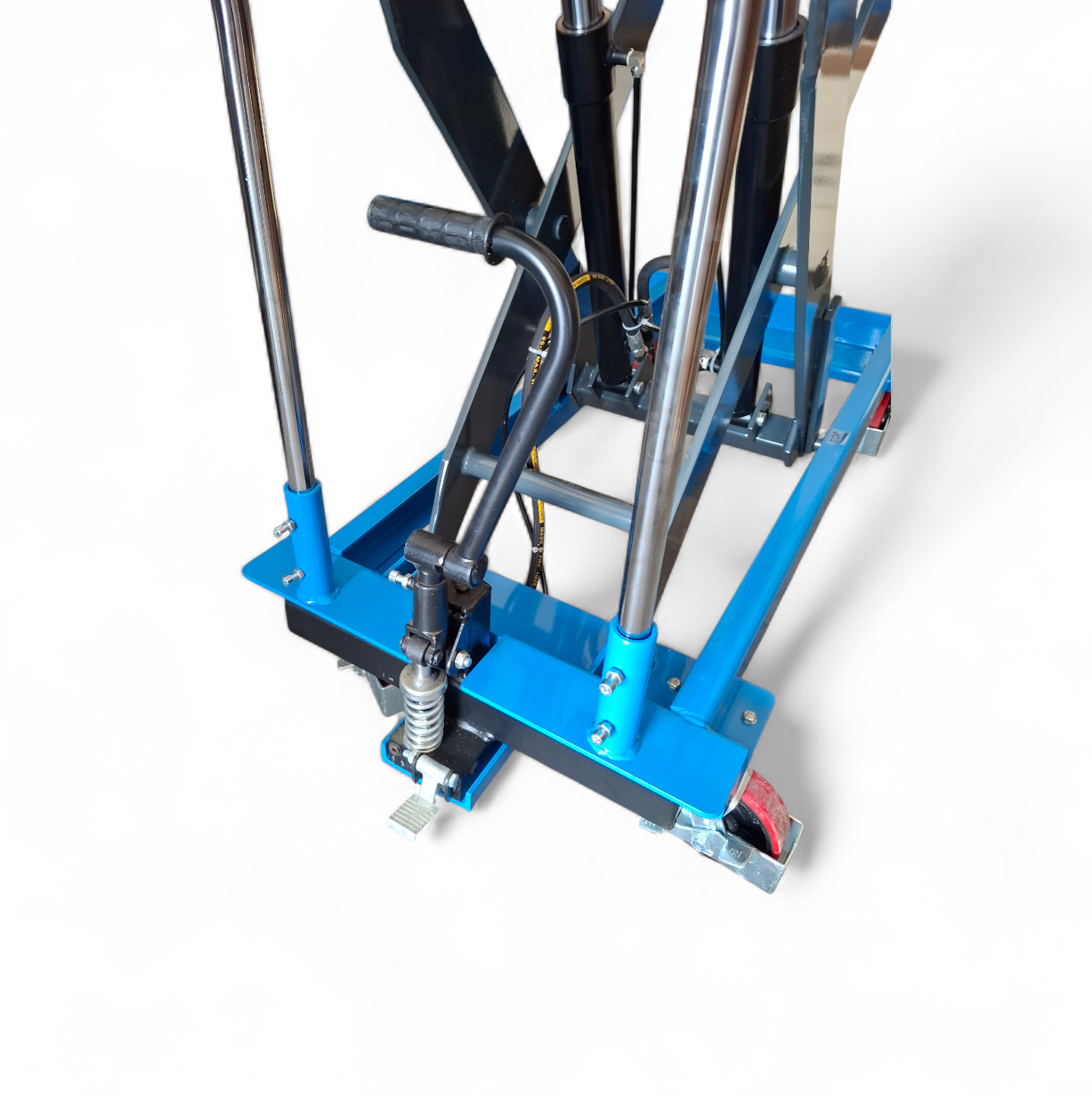 Precyzyjne wykonanie wszystkich elementów oraz stabilna konstrukcja nożyc zapewniają bezpieczną i komfortową pracę. Specjalnie zaprojektowany zawór spustowy umożliwia precyzyjną kontrolę opuszczania stołu nawet pod pełnym obciążeniem. Urządzenie wyposażone jest w wygodną pompę nożną, ułatwiającą obsługę, a solidne, łożyskowane koła wykonane z kompozytu oraz olejoodpornej gumy zapewniają płynne i łatwe manewrowanie stołem po warsztacie.