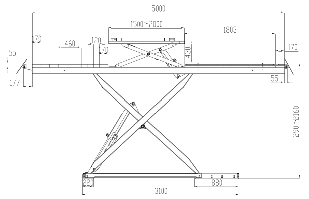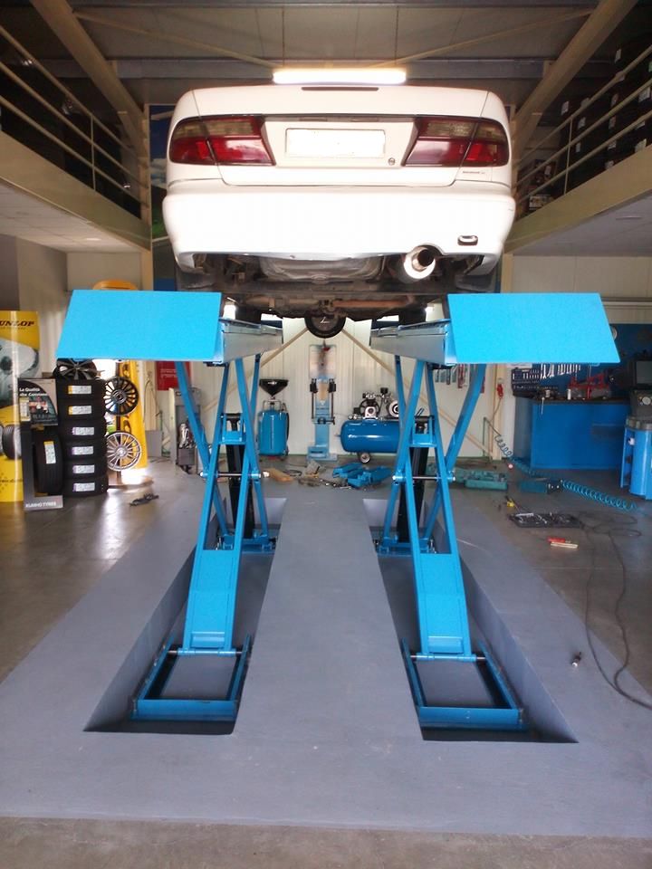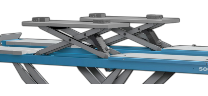 Podnośnik nożycowy diagnostyczny, elektrohydrauliczny idealny do pomiaru i regulacji geometrii. Platformy wyposażone w płyty rozprężne (luzujące) oraz zagłębienia pod obrotnice.