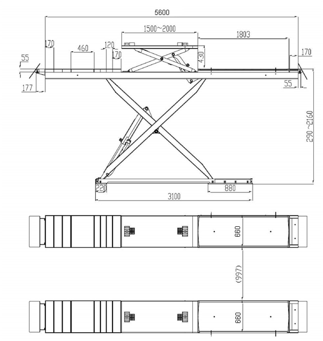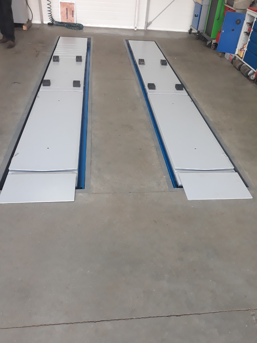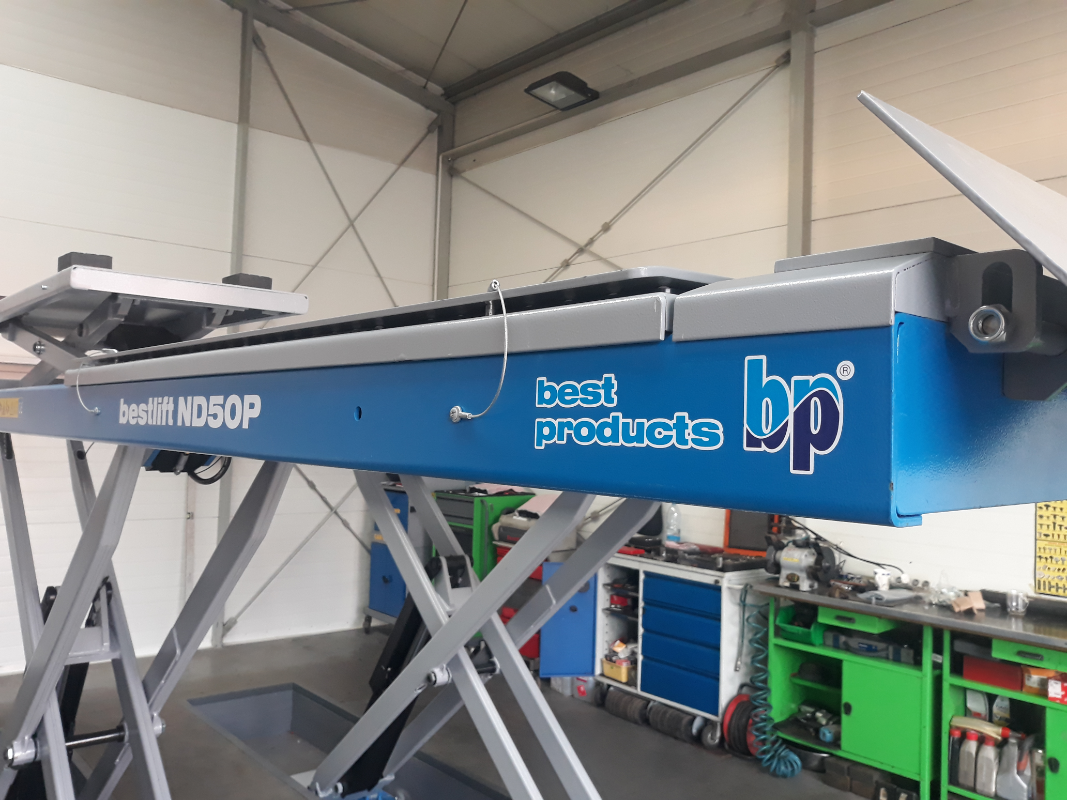 Podnośnik nożycowy diagnostyczny, elektrohydrauliczny idealny do pomiaru i regulacji geometrii. Platformy wyposażone w płyty rozprężne (luzujące) oraz zagłębienia pod obrotnice.