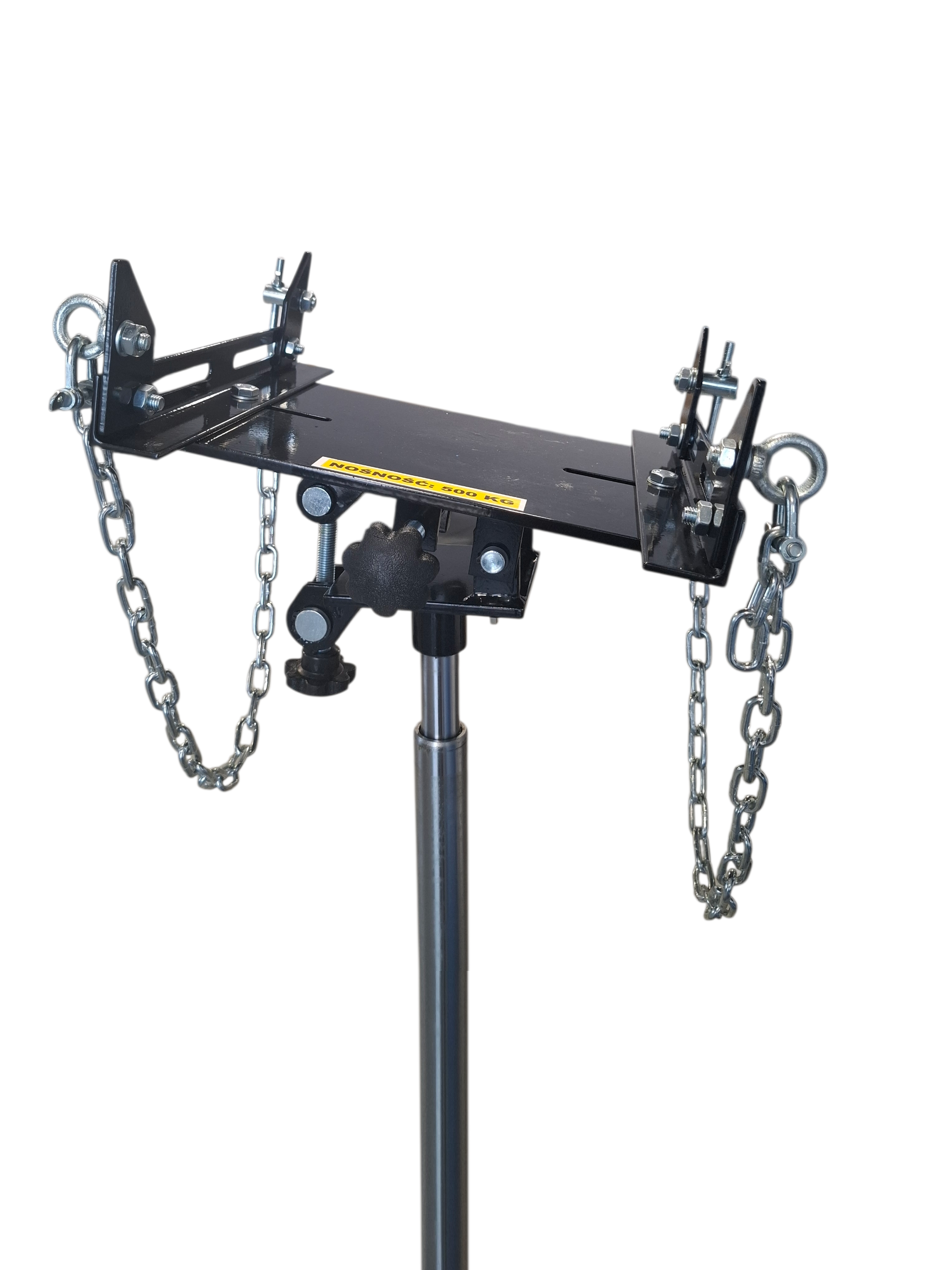W standardowym wyposażeniu podnośnika znajduje się uniwersalna płyta montażowa z możliwością regulacji w dwóch płaszczyznach – nachylenia oraz przesunięcia wzdłuż osi wału – co pozwala na precyzyjne ustawienie skrzyni biegów podczas montażu i demontażu. Do zestawu dołączono również łańcuchy i szekle zabezpieczające ładunek podczas podnoszenia.
