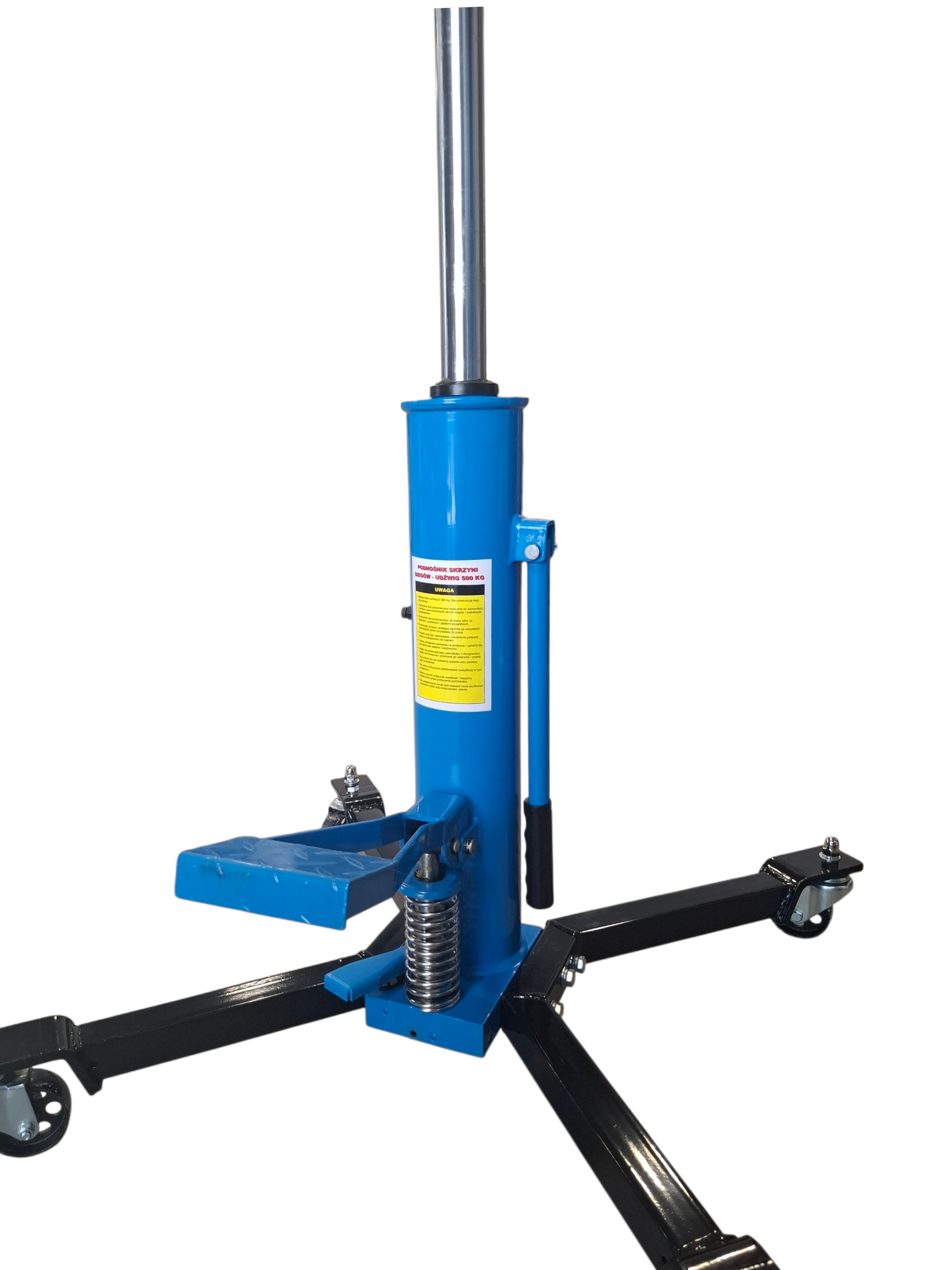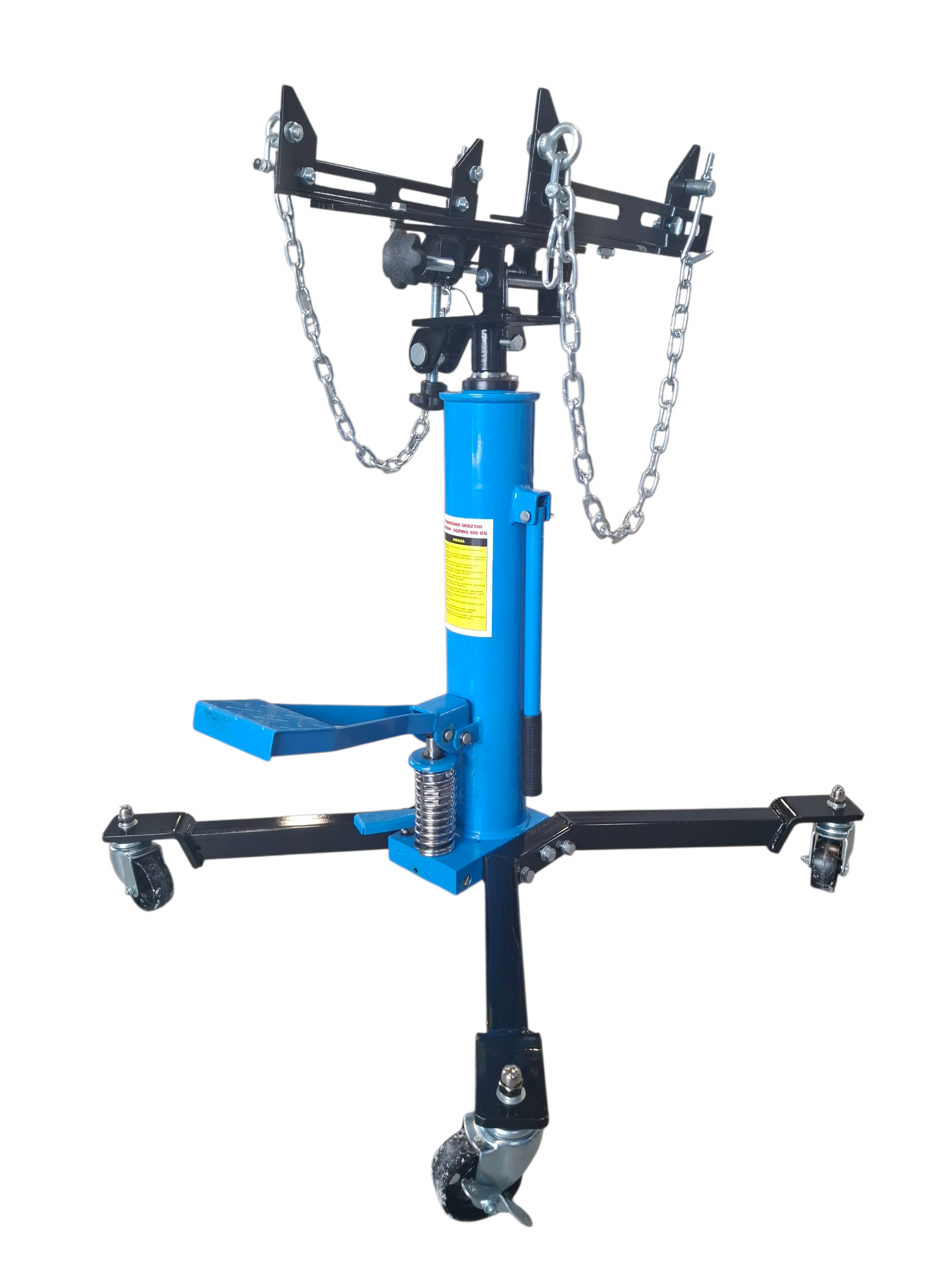 Hydrauliczny podnośnik skrzyni biegów przeznaczony do prac serwisowych pod podnośnikiem dwukolumnowym. Ułatwia bezpieczny demontaż i montaż skrzyń biegów, a także innych ciężkich elementów, takich jak poduszki silnika, elementy zawieszenia czy układ wydechowy.