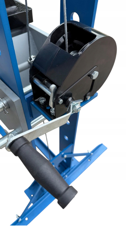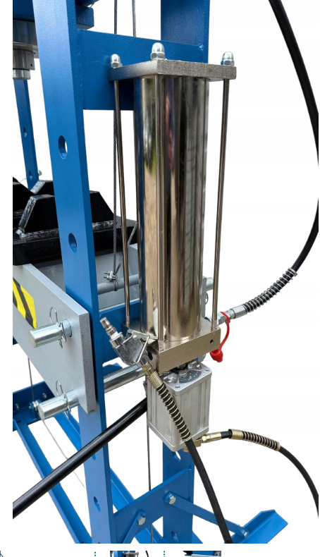 Posiada nacisk aż 75 tony, siłownik z pompą pneumatyczna do szybkiego operowania tłokiem.