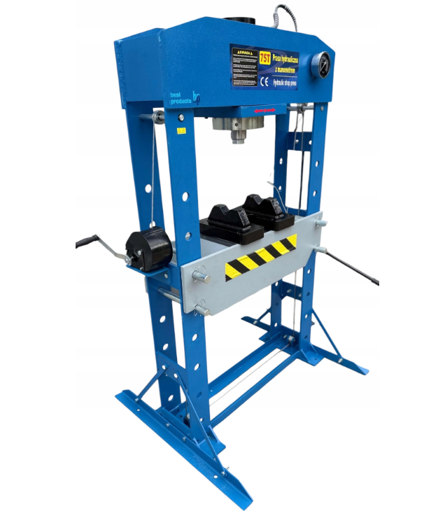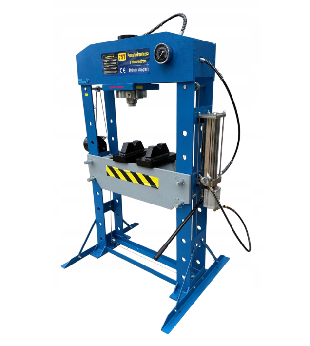 Prasa hydrauliczna stacjonarna o sztywnej i stabilnej konstrukcji, wyposażona w regulowany stół oraz siłownik o nacisku do 75 ton. Siłownik z pompą pneumatyczną umożliwia szybkie i wygodne operowanie tłokiem. Wysokość stołu roboczego regulowana jest w 8 stopniach, a jego podnoszenie odbywa się za pomocą mechanizmu korbowego. Łożyskowany wózek siłownika pozwala na łatwe przesuwanie go w poziomie.
